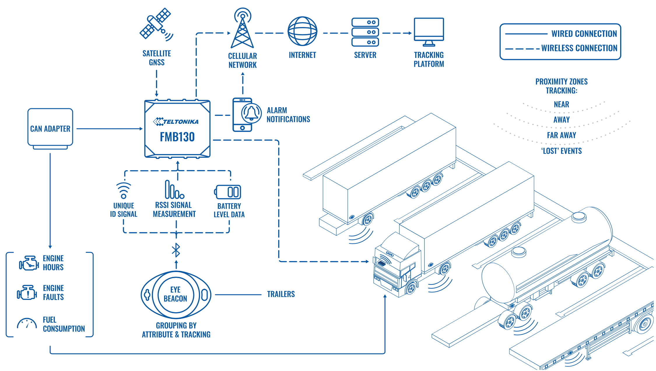 Das EYE-Beacon-Modell bietet zwei hervorragende Merkmale : „Näherungsereignis“ und „Erkennung durch Filter“. Diese Funktionen, gepaart mit weiteren Konfigurationsmöglichkeiten von Teltonika-GPS-Geräten bieten eine Auswahl verschiedener Einstellungen und Szenarien, um den Anforderungen moderner Logistik mittels Flottenmanagementsoftware zu erfüllen.